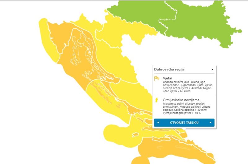 Od 17 sati upozorava na mjestimice obilne pljuskove praćene grmljavinom. Moguće su bujične i urbane poplave. Količina oborine bit će iznad 40 milimetara po metru, a vjerojatnost grmljavine veća od 50 posto. Moguće je i jače grmljavinsko nevrijeme te upozoravaju na izložena područja odnosno otvorene prostore.