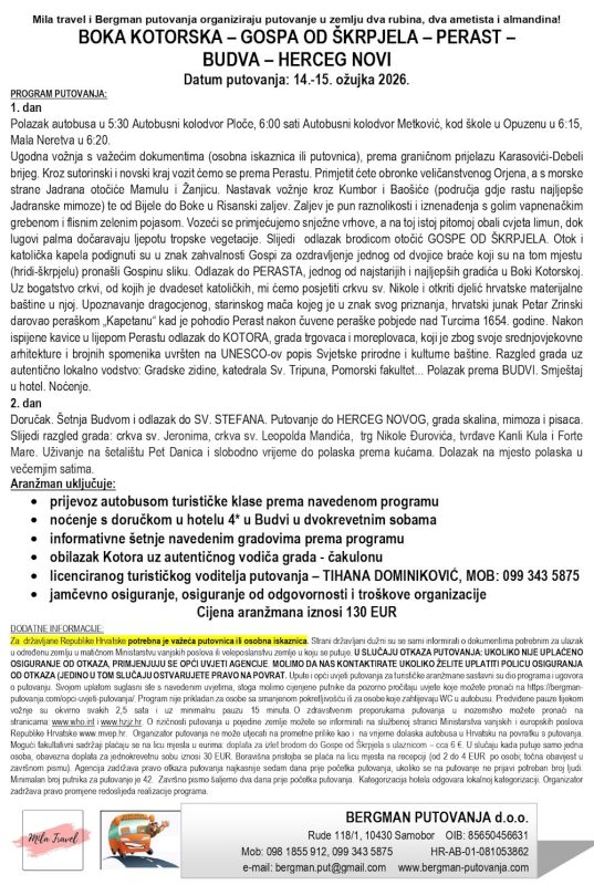 Mila travel i Bergman putovanja organiziraju od 14. do 15. ožujka 2025. putovanje u zemlju dva rubina, dva ametista i almandina: Boka kBokaotorska – Gospa od Škrpjela – Perst – Budva – Herceg Novi.