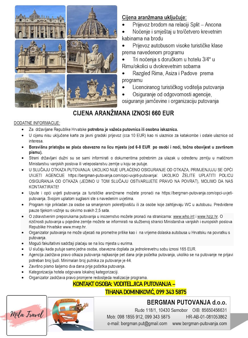 U Jubilarnoj godini, godini oprosta Mila travel i Bergman putovanja organiziraju od 3. do 6. prosinca 2025. putovanje u Italiju: Rim – Vatikan – Padova.