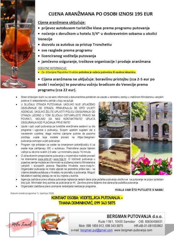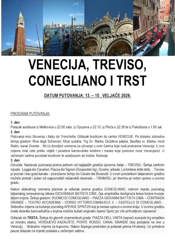Putničke agencije Mila travel i Bergman putovanja vode vas u Italiju: Venecija – Treviso – Conegliano – Trst, od 13. do 15. veljače 2026.