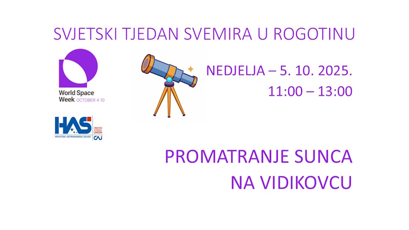 Svjetski tjedan svemira obilježava se ove godine u Rogotinu. Tjedan svemira ove godine započinje Međunarodnom noći motrenja Mjeseca, a Hrvatski astronomski savez učinio nam je izuzetnu čast gostujući tom prigodom upravo u Rogotinu. U dane vikenda Hrvatski astronomski savez u Rogotinu za javnost organizira motrenje Mjeseca, Saturna i Sunca u suradnji s lokalnim astronomima amaterima koje svojim entuzijazmom predvodi učitelj fizike Nikola Damić.