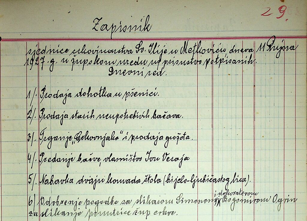 Nama je posebno zanimljivo da se u članku spominje Zapisnik crkovinarstva Župe sv. Ilije proroka Metkovićod 11. rujna 1927. i pogodba sa spomenutim slikarom koja je vezana uz oslikavanje unutrašnjosti metkovske župne crkve.