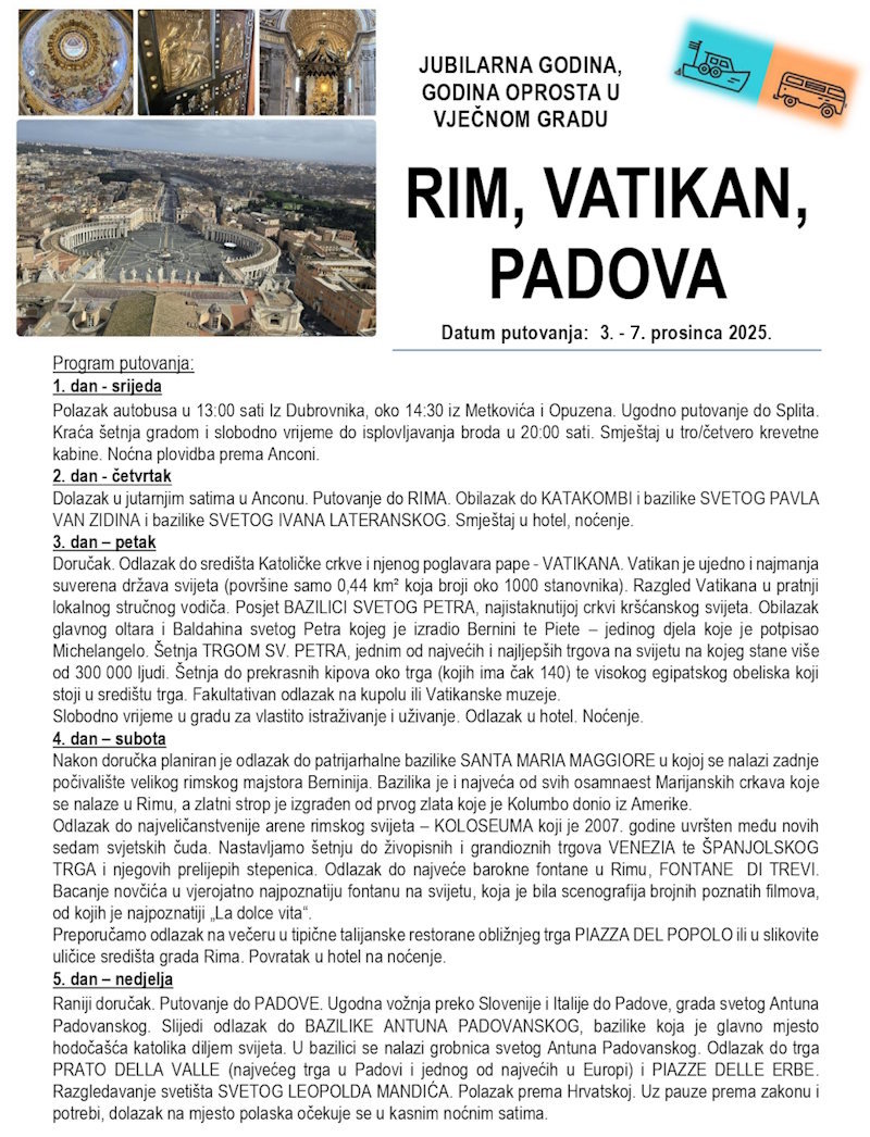 U Jubilarnoj godini, godini oprosta Mila travel i Bergman putovanja organiziraju od 3. do 7. prosinca 2025. putovanje u Italiju: Rim – Vatikan – Padova.