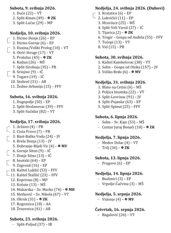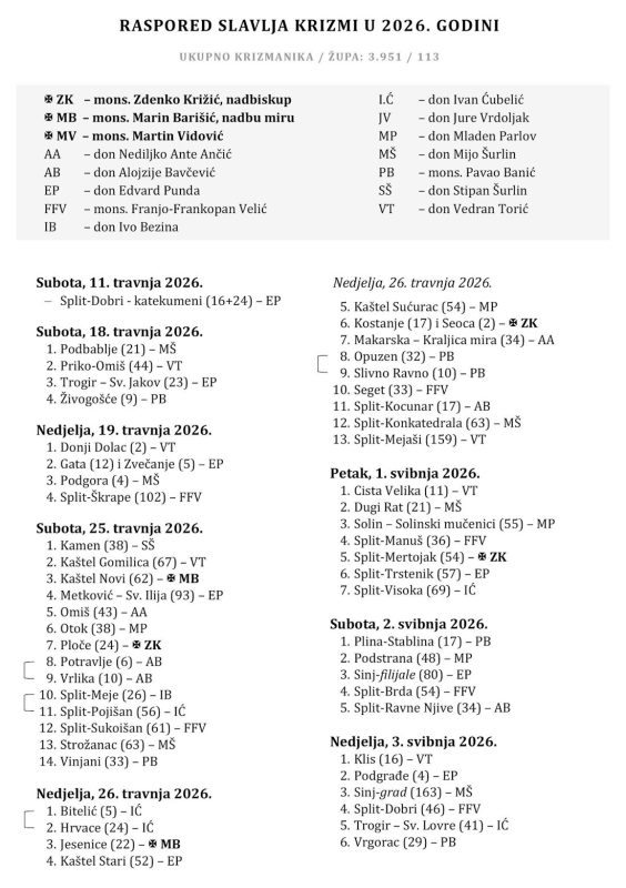 Splitsko-makarska nadbiskupija je objavila raspored slavlja krizmi i krizmatelja u 2026. godini: Metković – Sv. Ilija i Ploče 25. travnja (subota), Opuzen i Slivno 26. travnja (nedjelja), Plina-Stablina 2. svibnja (subota), Vrgorac 3. svibnja (nedjelja), Otrić-Struge 10. svibnja (nedjelja), Metković – Sv. Nikola i Dobranje-Bijeli Vir 17. svibnja (nedjelja), Vid 24. svibnja (Duhovi), Vidonje 5. srpnja (nedjelja), Bagalović 16. srpnja (četvrtak, Gospa Karmnelska).