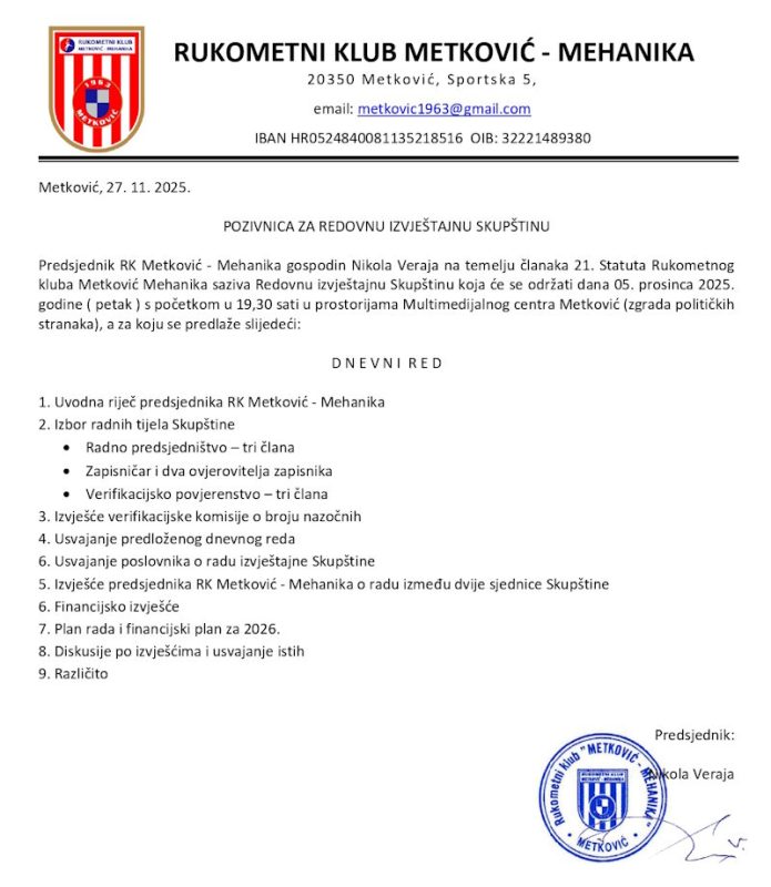 POZIV na redovitu izvještajnu skupštinu RK Metković Mehanike