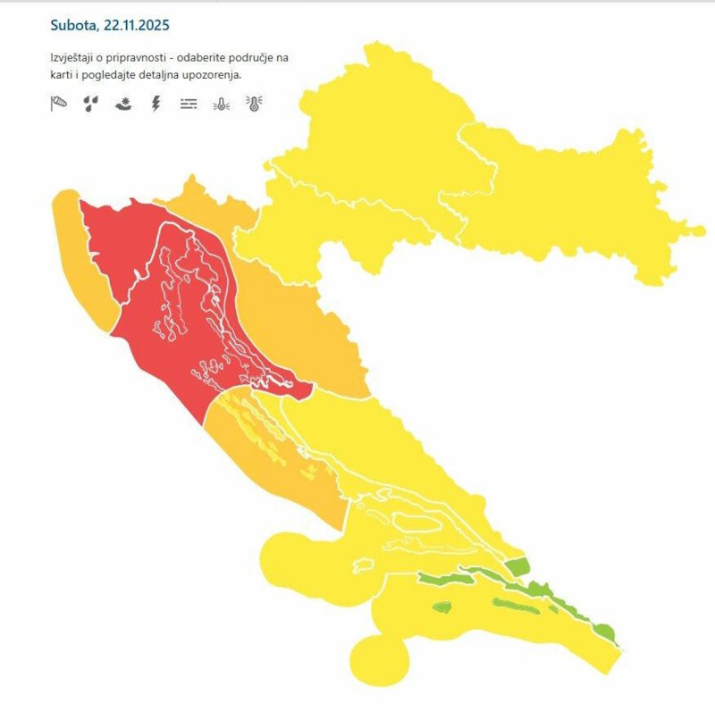DHMZ je izdao crveno upozorenje za riječku regiju te Kvarner i Kvarnerić, zbog olujne i jake, a mjestimice i orkanske bure, čiji bi udari mogli dosegnuti brzinu i do 90 čvorova, odnosno 165 km/h. Zbog snijega i poledice u gospićkoj je regiji na snazi narančasti meteoalarm, dok je u ostatku Hrvatske zbog istog razloga na snazi žuti meteoalarm. Jedino je dubrovačka regija u zeleno, piše Slobodna Dalmacija.